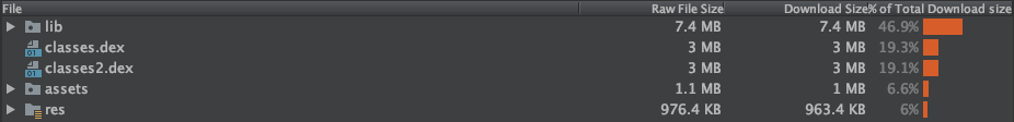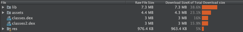 The assets folder is nearly a quarter of the total size of the APK at 4.3 MB. By switching to vector assets, we remove the need for the duplication of all of those images. Here’s a breakdown of the same app, this time built using all SVG assets.