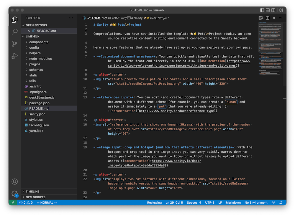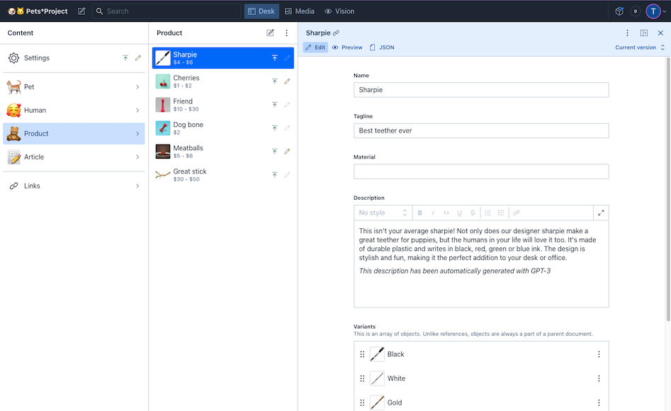The Pets Project Sample schema defines Pets, Humans and Products document types. We will focus on the Pets document type, specifically the block array field for the pet’s description. Sanity calls this block array Portable Text, and Portable Text allows you to extend rich text content with structured metadata in ways that let your content come to life!