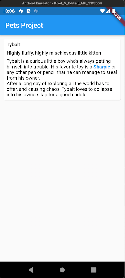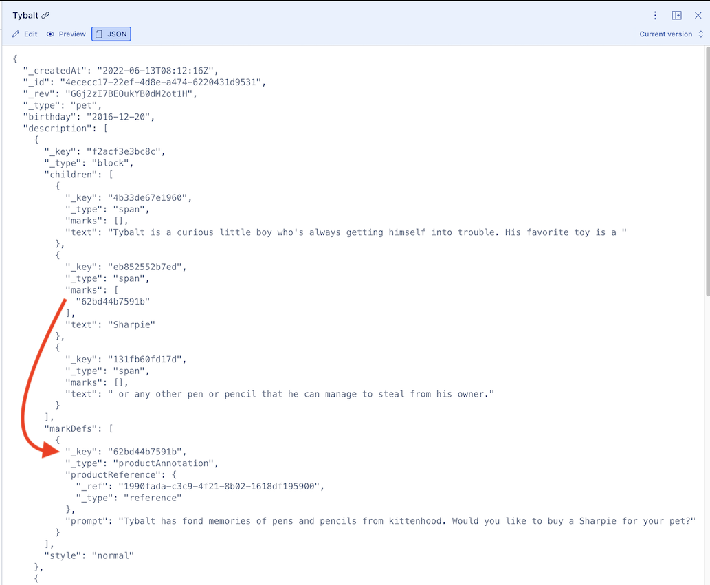 Let’s review the Tybalt Pet JSON to see how the annotation has changed the description property.
