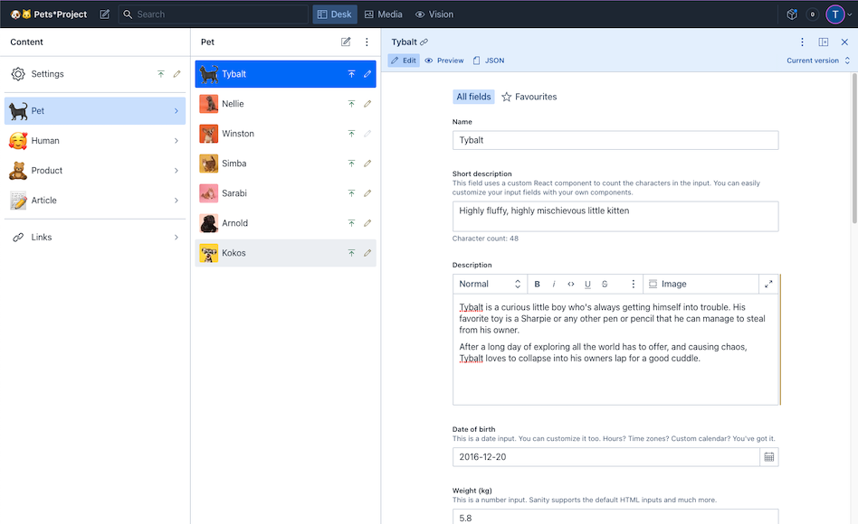 We will focus on the Tybalt pet. To see the description for Tybalt in the Sanity Studio, click on Pet on the left-most list and then click on Tybalt. You should see the following: