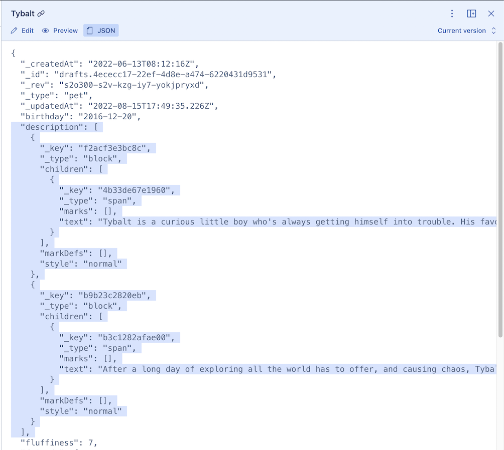 Now let’s look at the JSON that makes up the Tybalt pet. In the Sanity Studio, click on the JSON button in the toolbar at the top of the right-most panel.