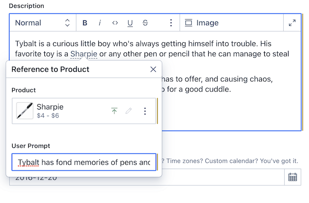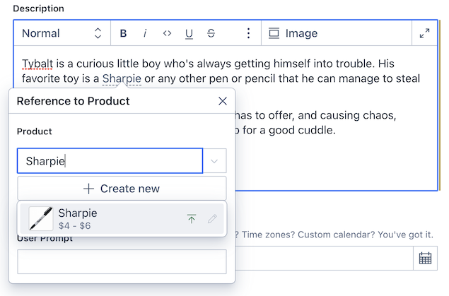 Highlight the word Sharpie in the Description text, click on the three-dot icon in the style menu bar above the text and choose Reference to Product.