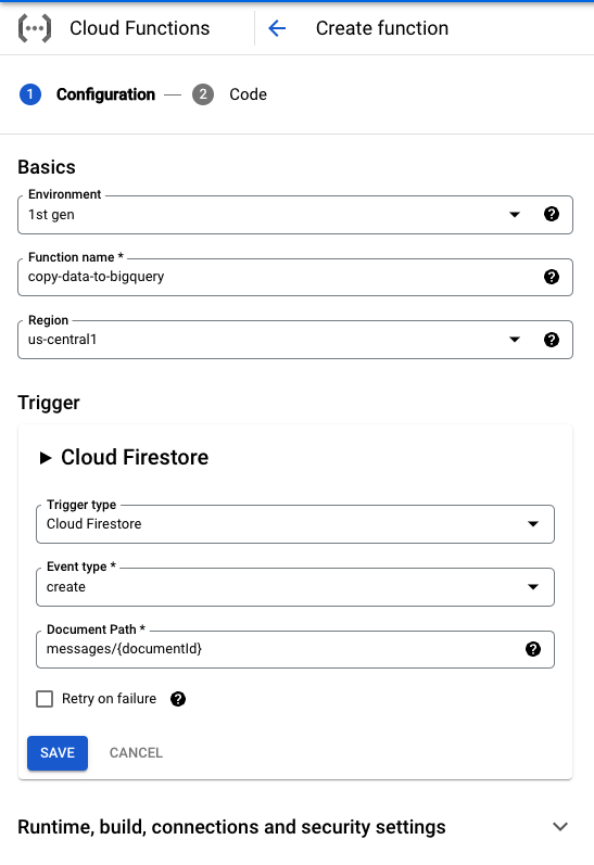 Note: We are using 1st generation Cloud Functions because 2nd generation uses EventArc and as we reported earlier in a medium post, EventArc doesn’t work well with Firestore events.