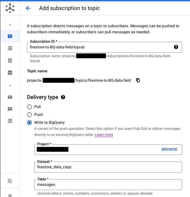 - Subscription ID: firestore-to-BQ-data-field-bqsub