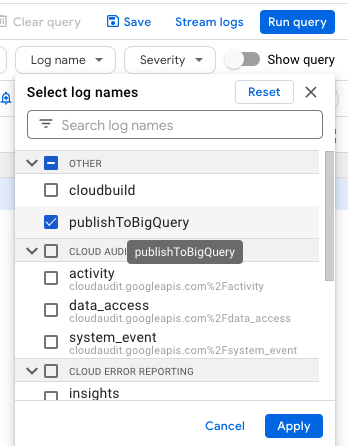 To filter out some noise and just get the logging output from the Cloud Function, click the Log Name button, check publishToBigQuery and click Apply.